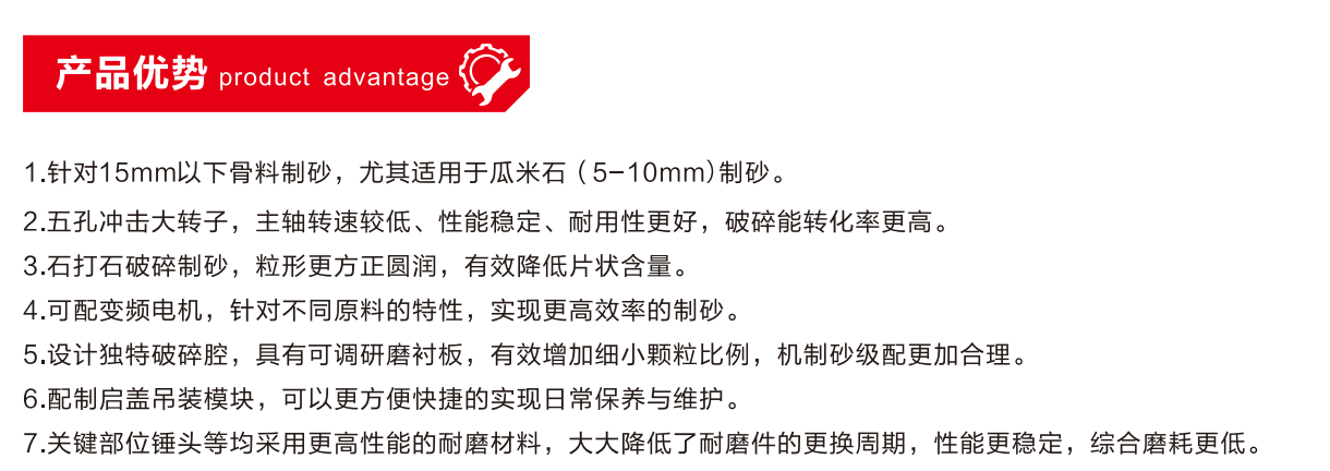 應用領域:針對15mm以下骨料制砂,尤其適用于瓜米石(5-10mm)制砂,解決目前市場上瓜米難處理的痛點;與市場普遍制砂設備相比,進料粒度范圍更大,小于15mm混合物料可直接進入制砂。